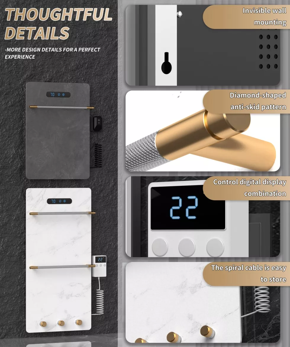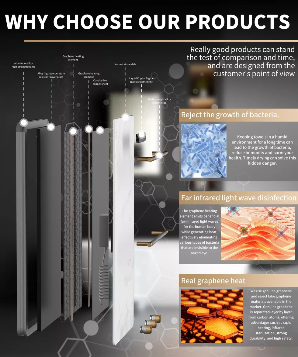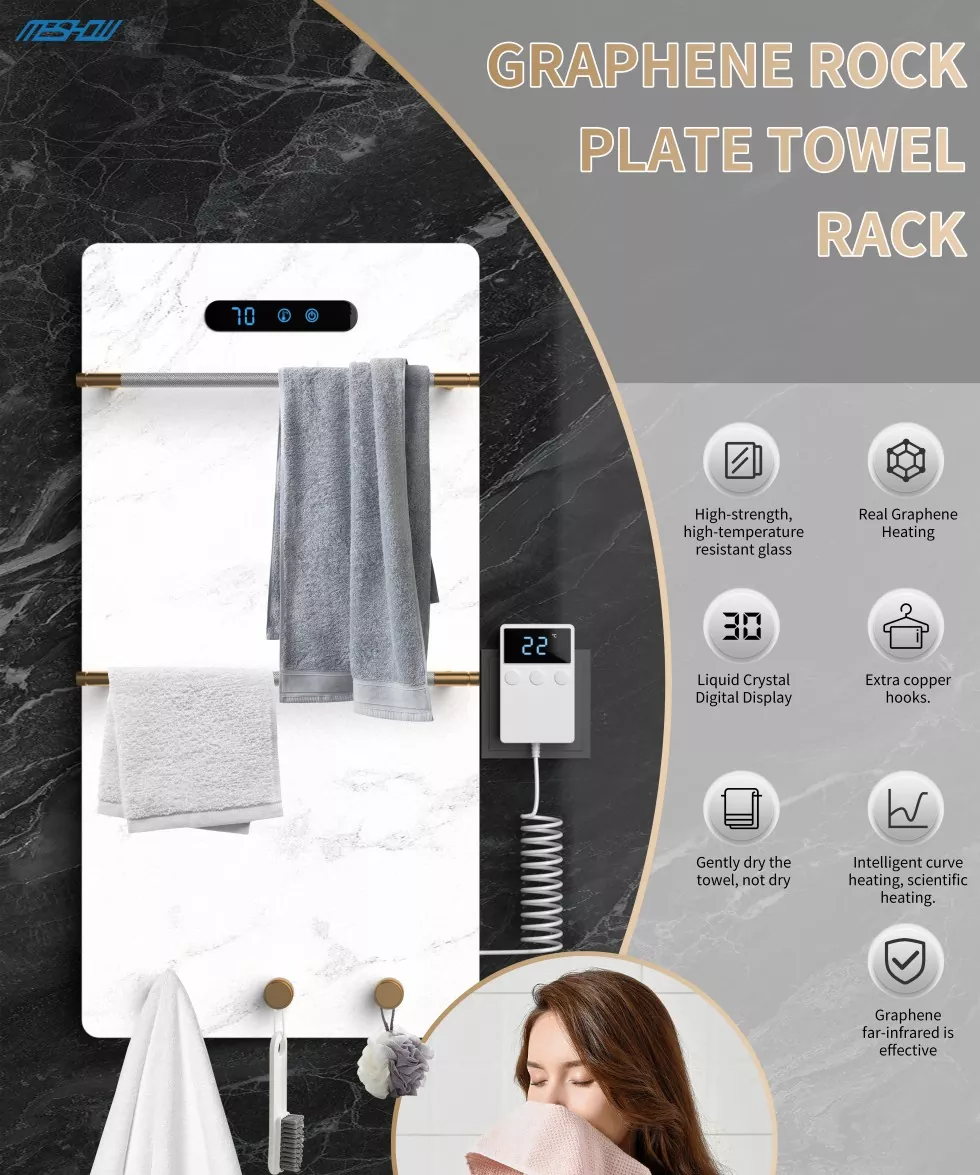 Kombinasjonen av hvite bergpaneler og matt metall hengende stolper er enkel, men stilig, egnet for en rekke boligdekorasjoner. Den naturlige tekstur og generelle tekstur av bergplaten forbedrer nivået på badet; IPX4 vanntette, ingen frykt for vanndråper, egnet for fuktige baderomsplasser. Graphene berghåndklestativ er raskt tørkende og effektivt, med langt infrarød sterilisering og effektiv forebygging av bakterier og midd, og holder håndklær rene. National Standard White Graphene Rock Frame, 3-års garanti, velkommen til å forhandle!
